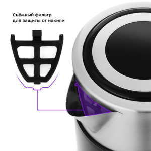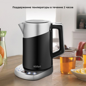 5 режимов нагрева воды. Чайник Kitfort KT-660 оснащён электронным терморегулятором, который позволяет не только вскипятить воду, но и нагреть её до 60, 70, 80, 90 С. Поддержание температуры. После подогрева воды чайник поддерживает заданную температуру ещё в течение 2 часов. Не нагревается во время работы. Снаружи чайник покрыт пластиком толщиной 2 мм, поэтому можно не бояться обжечься о внешнюю поверхность прибора. Защита от накипи. Современная конструкция чайника препятствует образованию накипи, облегчает уход, значительно снижает шум при нагревании воды.