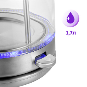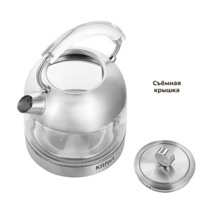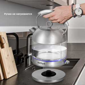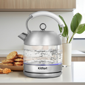 Стильный электрический чайник Kitfort КТ-6630 выполнен из сочетания трёх материалов — стекла, пластика и нержавеющей стали и предназначен для кипячения воды дома, в офисе или на даче. За счёт оригинального дизайна он идеально впишется в любой интерьер! За один раз в чайнике можно вскипятить до 1,7 л воды. Этого хватит, чтобы приготовить горячие напитки на большую семью! Мерная шкала позволяет легко следить за уровнем воды. В кнопку включения/выключения встроен индикатор нагрева. При включении чайника по периметру дна загорается синяя подсветка, которая является индикатором работы и одновременно подсвечивает кипящую воду. Широкая форма носика позволяет точно наливать воду в чашку без расплёскивания и брызг и быстро наполнять её. В носике чайника расположен фильтр, который задерживает частички накипи и предотвращает их попадание в чашку. Снизу имеется отсек для хранения шнура.
