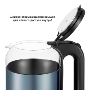 Электрический чайник Kitfort КТ-6644 предназначен для кипячения воды дома, в офисе, на даче. Ёмкость чайника 1,8 литров - этого хватит, чтобы приготовить горячие напитки на большую семью. Чайник автоматически отключается при закипании, имеет защиту от перегрева и от включения без воды. Образующийся пар внутри попадает в паропровод с термодатчиком. Корпус чайника выполнен из сочетания стекла, нержавеющей стали и пластика, а крышка — из нержавеющей стали и пластика. Максимальная и минимальная отметки нанесены на внутреннюю часть корпуса. Ручка чайника пластиковая, не нагревается и удобно лежит в руке. Подставка с центральным контактом дает возможность располагать на ней чайник в любом положении, обеспечивая вращение на 360 Снизу имеется отсек для хранения шнура, в который можно смотать излишки шнура электропитания.