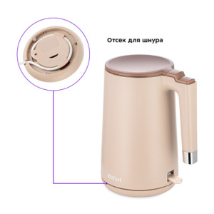 Электрический чайник КТ-6662 - отличное решение для ежедневного использования или особых моментов с родными и друзьями. У чайника двойные стенки, благодаря чему вода будет дольше оставаться горячей. Также двойные стенки защищают от ожога, так как практически не нагреваются. Внешняя часть чайника выполнена из пластмассы, а внутренняя поверхность из нержавеющей стали. Автоматическое отключение. Чайник автоматически отключается при закипании, имеет защиту от перегрева и от включения без воды. В кнопку включения/выключения встроен индикатор нагрева. Отметка максимального уровня воды располагается на внутренней поверхности прибора. Изнутри крышка и корпус выполнены из нержавеющей стали. Нагревательный элемент (ТЭН) у этой модели чайника скрытый и находится в донной части. Прибор имеет защиту от перегрева и от включения без воды. На дне подставки имеется отсек для хранения шнура.