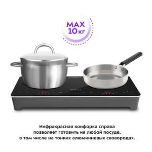 Индукционно-инфракрасная плитка Kitfort KT-164 практична и экономична. Эта плита использует современные технологии, позволяющие готовить ваши любимые блюда вкусно, быстро и абсолютно безопасно. Индукционная плитка почти исключает вероятность получения ожогов - рабочая поверхность едва нагревается при готовке. У инфракрасной нагрев происходит постоянно даже на минимальных мощностях. Поверхность нагревается только от контакта с горячей посудой. С помощью сенсорной панели управления вы можете настроить нужный нагрев до 1800 Вт, установить до 18 ступеней мощности и установить таймер до 24 часов. Для безопасности в плите встроена функция блокировки кнопок, чтобы не сбить заданные вами настройки. Для инфракрасной плитки подходит практическая любая посуда, однако рекомендуется использовать посуду с плоским дном. Для индукционной плитки подходит посуда с дном из ферромагнитных материалов.