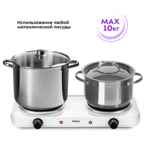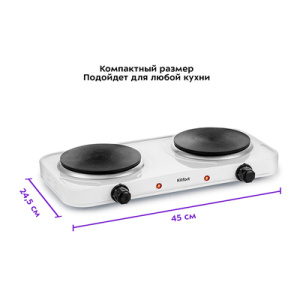 Электрическая плита КТ-173 поможет приготовить блюда самой разнообразной кухни. Плита компактная и простая в управлении, поэтому с приготовлением на ней справится любой. Прямой нагрев позволяет использовать любую металлическую посуду, даже алюминиевые сковороды. На плите КТ-173 можно готовить в любом месте, где есть электричество, это делает плиту универсальной и простой в использовании. Мощность каждой конфорки – 1000 Вт. Прямой нагрев позволяет использовать любую металлическую посуду. Плита выдерживает вес не более 10 кг. В плите установлены специальные термопредохранители для каждой конфорки, которые в случае перегрева плиты разорвут электрическую цепь и отключат нагрев. Корпус и конфорки плиты выполнены из металла, благодаря чему после приготовления еды вы можете с легкостью убрать плитку от остатков пищи и прочих загрязнений.