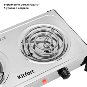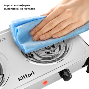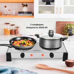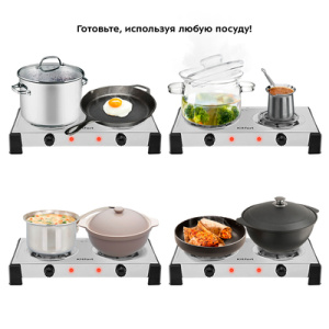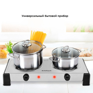 Электрическая плита КТ-180 с 2 конфорками поможет приготовить разнообразные блюда. Она не займёт много места и подойдёт для любой кухни, даже самой маленькой. Это универсальная и простая в использовании плита для дома, дачи или загородного дома. У электрической плиты 5 режимов нагрева от 130 до 380 С. В случае перегрева плиты, термопредохранители разорвут электрическую цепь и отключат нагрев. Конфорки представляют из себя 2 ТЭНа. Благодаря прямому нагреву, блюда готовятся достаточно быстро. Электрическая плита подходит для любой посуды. Диаметр конфорок стандартный - 14 см, что позволяет использовать посуду не только из разных материалов, но и размеров. На обратной стороне плиты есть вентиляционные отверстия, которые способствуют быстрому охлаждению. Корпус и конфорки выполнены из металла, поэтому плиту легко очистить от загрязнений.