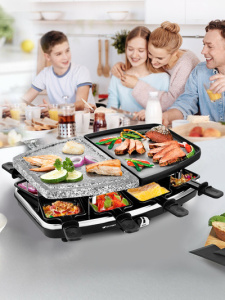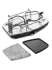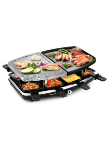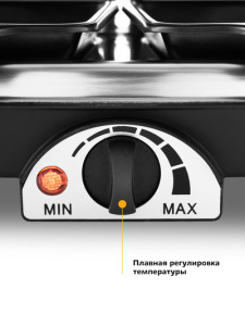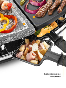 Раклетница Kitfort КТ-1649 - это устройство для приготовления разнообразных закусок, а также она может объединить вокруг себя тёплую компанию друзей. Это превосходная альтернатива традиционным застольям! Убедитесь сами! Приглашайте гостей и родственников, и устраивайте раклет-вечеринку. Пока на сковородках плавится сыр, ваши гости сами приготовят себе начинку по своему вкусу - обжарят кусочки картофеля или перца, приготовят стейк или колбаски. Устройство оснащено ТЭНом, под которым имеются специальные углубления для порционных сковородок для сыра. Сверху ТЭН закрывает панель, на которой можно обжаривать продукты. ТЭН раклетницы нагревает панель для гриля и расплавляет сыр в сковородках. Вы можете плавно менять температуру при помощи регулятора на корпусе прибора. Около регулятора расположен индикатор нагрева.