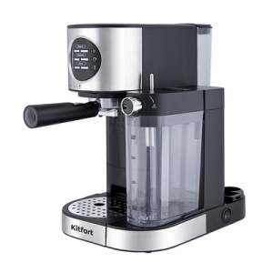 Побалуй себя чашечкой кофе. Рожковая Кофеварка Кіtfort КТ-703 поможет приготовить такие кофейные напитки как эспрессо, капучино или латте. А высокое давление в 15 Бар позволит раскрыть весь аромат молотого кофе. Удобное управление. Тип и объём напитка выбирается одним нажатием кнопки, а густая молочная пенка приготовляется во встроенном автоматическом капучинаторе. Регулятор подачи молока. С помощью регулятора подачи молока можно установить необходимое количество подаваемого молока. Поддон для капель. Поддон для сбора капель с решёткой из нержавеющей стали легко снимается, моется и устанавливается обратно. Стильный дизайн. Кофеварка Кіtfort КТ-703 – настоящее украшение кухни. В комплекте с устройством прилагается мерная ложка-темпер.