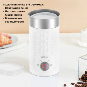 Капучинатор КТ-7128 создан для приготовления молочной пенки для напитков на базе эспрессо - капучино, латте и латте макиато. Прибор работает в четырёх режимах - плотная или воздушная пенка с нагревом, смешивание с нагревом и вспенивание без. Стенки капучинатора не будут горячими после окончания работы из-за особенности конструкции устройства - вы не обожжётесь, когда будете брать капучинатор в руку. Управление КТ-7128 осуществляется с помощью кнопки ''Вкл/Выкл''. Капучинатор автоматически отключается, когда процесс вспенивания или смешивания выполнен. Также вы можете остановить процесс приготовления вручную при необходимости. Подставка с центральным контактом даёт возможность располагать на ней корпус в любом положении, обеспечивая вращение на 360 Капучинатор — идеальный выбор для тех, кому не хочется осваивать процесс самостоятельного вспенивания молока, следить за температурой.