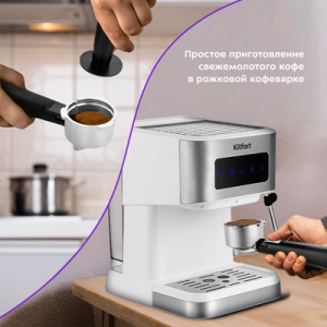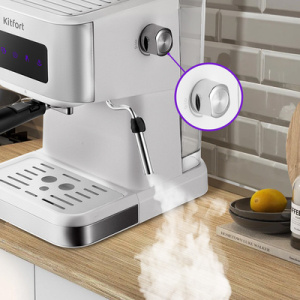 Рожковая кофеварка КТ-7139 поможет приготовить эспрессо, капучино или латте, а также множество других видов кофе на наш вкус. На сенсорной панели управления расположены кнопки с необходимыми функциями, такие как эспрессо/двойной эспрессо, кнопка подачи пара. Молотый кофе помещается в фильтр рожка, прессуется в таблетку темпером, затем вода проливается сквозь кофе под давлением. Напиток получается без примеси гущи, сохраняется оригинальный вкус зёрен, большое количество полезных веществ и тонкий аромат кофе. На платформе можно хранить темпер или ставить чашки, чтобы они были тёплыми или лучше сохли после мытья. На платформе удобно размещать чашки во время приготовления молочной пены. К моменту, когда вы закончите, чашки успеют подогреться. Резервуар для воды съёмный – его можно легко снять и наполнить водой в любом удобном месте.