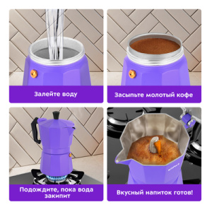Гейзерная кофеварка КТ-7146 – простой и эффективный способ приготовления кофе в домашних условиях. Напиток ''из гейзера'' получается плотным, что-то среднее между фильтровым методом и эспрессо. С гейзерной кофеваркой нет необходимости следить за подъёмом пенки, а готовый кофе не содержит гущи. KT-7146 рассчитана на приготовление до 3 чашек кофе. Корпус выполнен из алюминия. В резервуар наливают воду и устанавливают воронку с фильтром, куда добавляют молотый кофе. Сверху накручивается резервуар для кофе. Можно легко разобрать на составные части - резервуар для кофе откручивается от резервуара для воды, а для удаления кофейных осадков достаточно разобрать воронку с фильтром. Гейзерную кофеварку КТ-7146 можно использовать на различных варочных поверхностях, за исключением индукционных плит. Рекомендуется устанавливать плиту на среднюю мощность при приготовлении кофе в этой кофеварке.