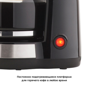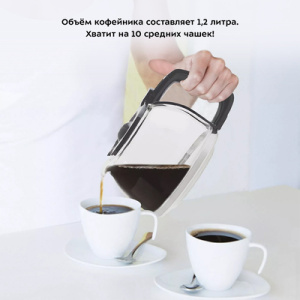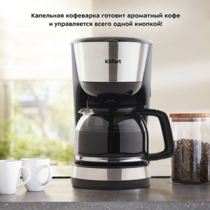 Наслаждайтесь свежесваренным кофе! Капельная кофеварка Кіtfort КТ-715 готовит ароматный кофе и управляется всего одной кнопкой! Максимальное удобство. Платформа, на которой стоит кофейник с готовым кофе, имеет постоянный не отключающийся подогрев. Наслаждайтесь горячим кофе в любое время! Вместительный кофейник. Объём кофейника составляет 1,2 литра. Этого хватит примерно на 10 средних чашек, поэтому владельцу не придётся часто доливать воду. Капля-стоп. Кофеварка оборудована противокапельной системой - затвором, приостанавливающим подачу кофе при вынимании кофейника из кофеварки. Вы можете налить кофе в чашку, не дожидаясь окончания приготовления.