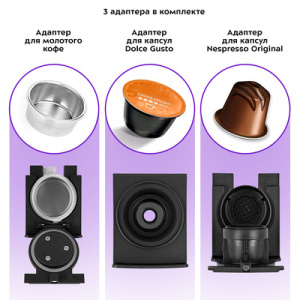 Кофеварка ''3 в 1'' КТ-7230 – многофункциональное устройство, сочетающее в себе функции капсульной и рожковой кофеварки. Она поможет приготовить кофе эспрессо, американо или лунго, а также множество других видов кофе на ваш вкус. Благодаря адаптерам кофеварка подходит для капсул типа Nespresso Original и Dolce Gusto, а также для молотого кофе. Капсульные кофеварки позволяют сделать процесс приготовления удобным. Необходимо просто поместить капсулу в адаптер, а адаптер - в кофеварку. В комплекте идут 2 адаптера для капсул типа Nespresso Original и Dolce Gusto. Резервуар для воды съёмный - его можно легко снять и наполнить водой в любом удобном месте. Крышка резервуара открывается, поэтому можно налить воду в резервуар, не снимая его. Регулярно очищайте поддон и решётку. Вытащите поддон из кофеварки, снимите решётку, слейте накопившуюся жидкость. Решётку и поддон вымойте в тёплой воде.