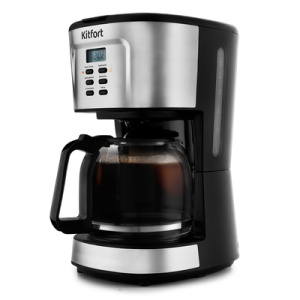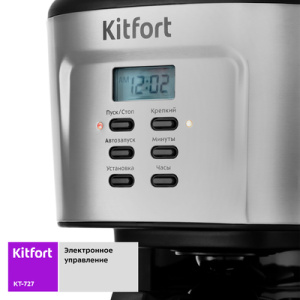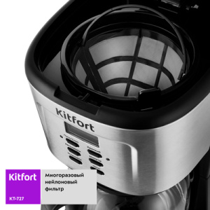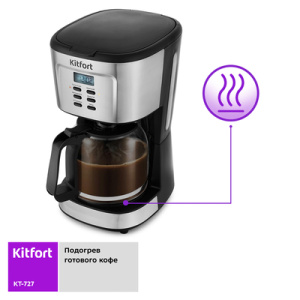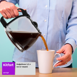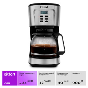 Капельная кофеварка Кіtfort КТ-727 поможет приготовить ароматный кофе из молотого кофе. Она компактная и простая в использовании. Режим автозапуска позволит вам настроить автоматическое приготовление кофе к нужному часу без вашего участия. По окончании приготовления кофеварка перейдёт в режим подогрева. Платформа с подогревом, на которой стоит кофейник с готовым кофе, будет горячей в течение 40 минут, затем кофеварка выключится. Кофеварка оборудована противокапельной системой - затвором, приостанавливающим подачу кофе при вынимании кофейника из кофеварки. Резервуар ёмкостью 1,5 л позволяет за один раз приготовить кофе на 12 чашек ёмкостью 120 мл. Корпус кофейника прозрачный, поэтому вы всегда можете видеть, сколько кофе еще осталось. Кофеварка оснащена многоразовым нейлоновым фильтром, который удобно мыть после приготовления кофе и использовать снова.