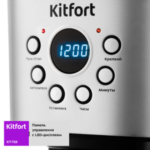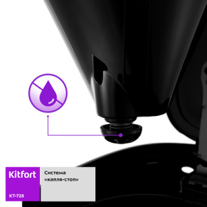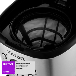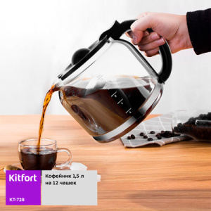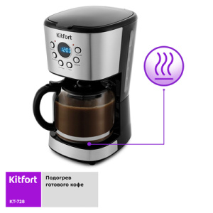 Капельная кофеварка Кіtfort КТ-728 поможет приготовить ароматный кофе из молотого кофе. Она компактная и простая в использовании. Режим автозапуска позволит вам настроить автоматическое приготовление кофе к нужному часу без вашего участия. В установленное время кофеварка автоматически начнёт приготовление, а вам останется только подойти и насладиться вкусным ароматным напитком. По окончании приготовления кофеварка перейдёт в режим подогрева. Платформа с подогревом, на которой стоит кофейник с готовым кофе, будет горячей в течение 40 минут, затем кофеварка выключится. Кофеварка оборудована противокапельной системой - затвором, приостанавливающим подачу кофе при вынимании кофейника из кофеварки. Резервуар ёмкостью 1,5 л позволяет за один раз приготовить кофе на 12 чашек ёмкостью 120 мл.