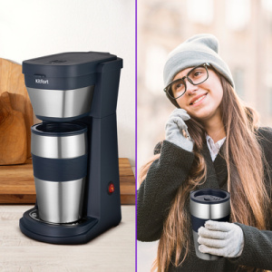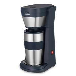 Капельная кофеварка Кіtfort КТ-7301 поможет приготовить ароматный кофе из молотого кофе. Она компактная, простая в использовании и идеально подойдёт для приготовления кофе в домашних условиях. В капельной кофеварке горячая вода медленно поступает в фильтр с молотым кофе. Пройдя через него, она попадает в термокружку. Термокружка выполнена из пластика и нержавеющей стали с силиконовой вставкой, которая не даёт вам обжечься. Крышка термокружки позволяет пить кофе на ходу, благодаря удобной форме отверстия для питья, которое можно закрывать. Кнопка ''Вкл/Выкл'' включает и выключает устройство. Во время приготовления кофе горит индикатор работы. Фильтр вмещает до 20 грамм молотого кофе, а ёмкость резервуара для воды составляет 420 мл. Капельная кофеварка КТ-7301 удобно разбирается для быстрого ухода – так прибор легко поддерживать в чистоте.