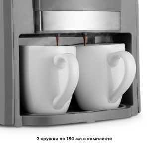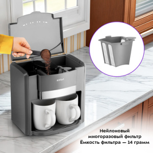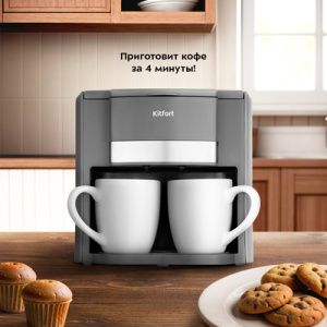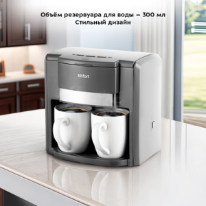 Капельная кофеварка Кіtfort КТ-7302 поможет приготовить ароматный кофе. Она очень компактная, простая в использовании и идеально подойдёт для приготовления кофе в домашних условиях или в офисе. Кнопка ''Старт'' включает и выключает устройство. Во время приготовления кофе горит индикатор работы. Процесс приготовления занимает около 4-х минут. Фильтр вмещает до 14 грамм молотого кофе, а ёмкость резервуара для воды составляет 300 мл. Многоразовым фильтром можно пользоваться неограниченное количество раз. Сетка фильтр изготовлена из нейлона. В капельной кофеварке горячая вода медленно поступает в фильтр с молотым кофе. Пройдя через него, она попадает в кружки. Кофеварка предназначена для приготовления двух порций кофе одновременно. Кофеварка КТ-7302 выполнена в оригинальном минималистичном дизайне.