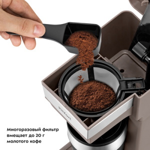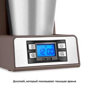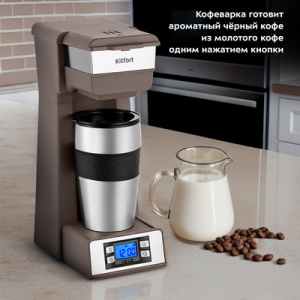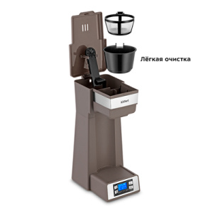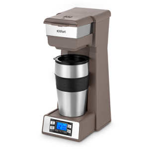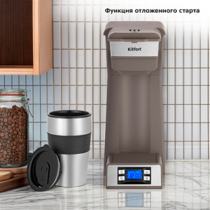 Капельная кофеварка КТ-7307 готовит ароматный чёрный кофе из молотого кофе одним нажатием кнопки. Кофеварка лёгкая и занимает мало места, что очень удобно в квартирах с маленькими кухнями. Многоразовый фильтр позволяет заваривать кофе неограниченное количество раз. Многоразовый фильтр вмещает до 20 г молотого кофе. А в резервуаре для воды есть специальные отметки, которые помогают налить необходимый объём воды для приготовления кофе. Термокружка сохранит тепло вашего кофе. Она выполнена из пластика и нержавеющей стали с силиконовой вставкой, которая не даёт вам обжечься или выронить из рук термокружку. В кофеварке горячая вода медленно поступает в фильтр с молотым кофе. Также кофеварка оснащена прорезиненными ножками, которые предотвращают скольжение по столу. Данная кофеварка поддерживает функцию отложенного старта, которая позволяет задать нужное время приготовления кофе.