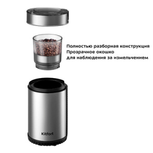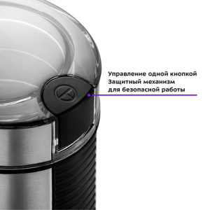 Кофемолка КТ-7109 предназначена для помола кофейных зерен и измельчения специй. Кофемолка даёт равномерный помол и позволяет настроить его степень - от мелкого - для эспрессо кофеварки, до крупного - для френч-пресса. Кофемолка КТ-7109 проста в эксплуатации - она включается нажатием на единственную кнопку на крышке. Защитный механизм не позволит включить кофемолку, если крышка установлена неправильно. В чаше кофемолки установлены ножи с двумя лезвиями для эффективного измельчения зерен кофе и специй. Ножи при включении кофемолки быстро вращаются и рубят зерна. Степень помола зависит от продолжительности работы. Кофемолка укомплектована крышкой с прозрачным окошком для наблюдения за процессом измельчения. Съемная чаша позволяет удобно извлекать перемолотые ингредиенты. Кроме того, кофемолку КТ-7109 легко очищать после использования.