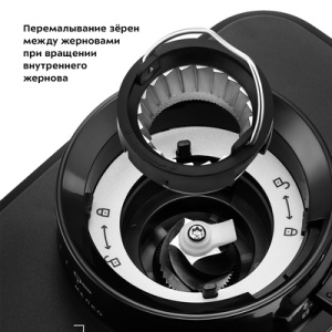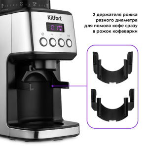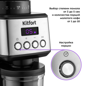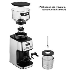 Жерновая кофемолка КТ-790 предназначена для помола кофейных зёрен. Кофемолка даёт равномерный помол и позволяет настроить его степень - от мелкого - для эспрессо кофеварки, до крупного - для френч-пресса. Регулятором помола можно настроить степень помола - от тонкого - для кофеварки эспрессо, до крупного - для френч-пресса. Кнопка ''Настройка порции'' позволяет задать время в секундах для помола одной порции. Минимальное время измельчения одной порции — 3 сек., максимальное — 5 сек. Также кнопкой можно установить количество порций для измельчения от 1 до 10. Комплектацией предусмотрены два держателя для рожка. Один для рожка диаметром 51±2 мм, второй для рожка диаметром 58±2 мм. Резервуар для кофейных зёрен ёмкостью 320 г и резервуар для молотого кофе ёмкостью 130 г съёмные и комплектуются крышками. Щёточкой можно очищать внутренний и внешний жернова и отверстие для выхода молотого кофе.