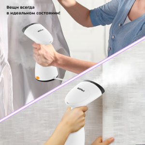 Ручной отпариватель КТ-9143 быстро приведёт в порядок вещи и практически в любом месте без использования гладильной доски. Ворсовая насадка предназначена для очистки одежды от грязи и шерсти домашних животных. Шерсть прилипает к одежде из-за статического электричества, и её довольно проблематично счистить. Пар снимает с шерсти электрический заряд, и она легко собирается. Чтобы проще было отслеживать количество воды в бойлере, устройство имеет окошко для контроля уровня воды. Для удобного добавления воды в комплекте предусмотрен мерный стакан со специальным зауженным носиком. КТ-9143 обладает такими достоинствами, как минималистичный дизайн, простое управление и компактный размер. Его удобно брать в деловые поездки или в путешествие и за считанные минуты отпарить вещь, которая может просто висеть на вешалке.