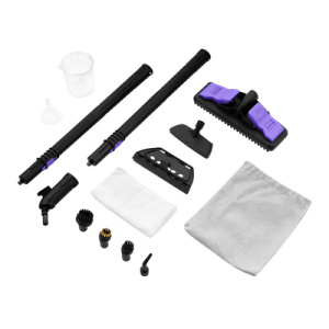 Kitfort КТ-9104 способен заменить паровую швабру, дезинфектор, стеклоочиститель, отпариватель. Скребок для стекла используется для чистки окон, зеркал, кафеля. Струйная насадка подходит для чистки плинтусов, щелей и других углов. Щётки - для удаления стойких загрязнений. На напольную щётку устанавливается тряпка с помощью специальных зажимов. Курок подачи пара удобно располагается под пальцами. Для обеспечения безопасности он оснащён блокиратором, чтобы исключить случайную подачу пара. На корпусе есть кнопка включения/выключения, а также индикатор готовности пара. В комплекте с пароочистителем идёт мерный стакан. Ёмкость составляет 1,8 л. Он служит не только для более удобного хранения шнура, но и для того, чтобы можно было поставить на парковку щётку с удлинительной трубкой. В комплекте с пароочистителем идёт сумка для их хранения.