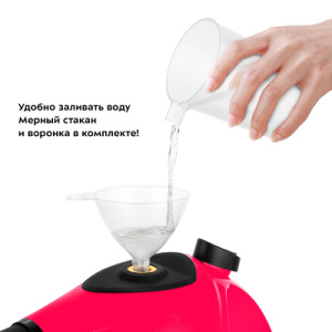 Пароочиститель Kitfort КТ-9138 – этот прибор способен заменить дезинфектор, стеклоочиститель и отпариватель. Специальная крышка на верхней части корпуса оснащена защитным механизмом. Для вашей безопасности крышка не открутится, пока температура и давление в бойлере не понизятся. В комплекте с пароочистителем идёт воронка и мерный стакан, которые нужны, чтобы обеспечить удобство и безопасность процесса наливания воды в бойлер. Если установить насадку с резиновым скребком, то можно очистить любые гладкие поверхности вроде окон или зеркал. Надетая на насадку тряпка подойдёт для отпаривания ткани и обивки мягкой мебели. Сопло струйной насадки создаёт мощную струю пара, способную напором выбить грязь из щелей и углублений. С угловой насадкой удобнее очищать углы и радиаторы отопления. Круглая нейлоновая щётка используется для удаления более стойких загрязнений.