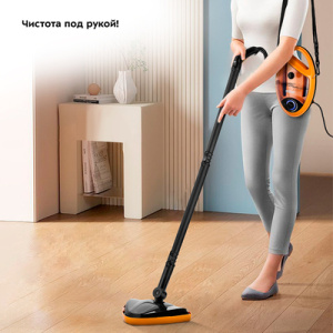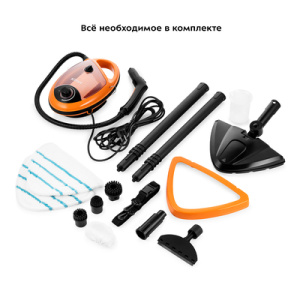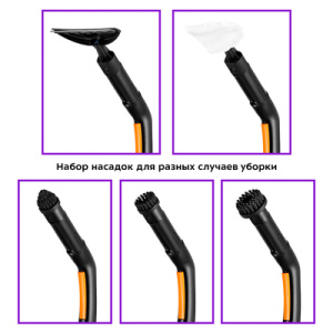 Пароочиститель КТ-9158 — многофункциональный аппарат, способный заменить паровую швабру, дезинфектор, стеклоочиститель и отпариватель для тканей. Регулятор подачи пара включает и выключает устройство, а также позволяет плавно регулировать интенсивность подачи пара. Индикатор вокруг барабана показывает режим работы бойлера красным и синим цветом. Удлинительная трубка надевается на паровой пистолет, а с другой стороны к ней присоединяется щётка для пола. Тряпка для пола крепится к щётке на липучке. В комплекте есть рамка для пола. Скребок для стекла используется для чистки окон, зеркал и кафеля. Скребком с тряпкой можно отпаривать текстильные предметы. Малая, большая и коническая нейлоновые щётки используются для чистки, когда требуется механическое воздействие. Корпус пароочистителя КТ-9158 держится на ремне через плечо. В комплекте мерный стакан. Ёмкость резервуара составляет 950 мл.