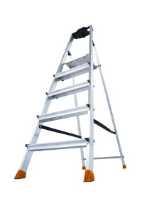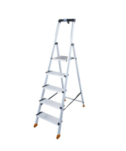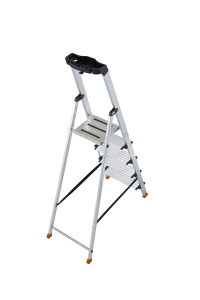 Односторонняя алюминиевая стремянка c высокой дугой безопасности, с большой противоскользящей площадкой. Большая мультифункциональная полка с крючком для ведра, отверстиями для инструмента и эргономичной опорой. Профилированные ступеньки шириной 125 мм для безопасного подъема и удобного положения при работе. Прочное заклепочное соединение ступенек с боковинами. Увеличенные, по сравнению со стандартными, нескользящие опорные наконечники для большей устойчивости. Важным преимуществом являются двухкомпонентные наконечники боковин с резиновым основанием.