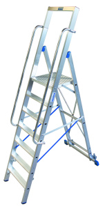 Мобильная стремянка с большой комфортабельной площадкой и дугой безопасности. Очень высокая дуга безопасности (1 м) с вмонтированной полкой для более удобной работы. Большая площадка 500 х 450 мм. Траверса с роликами обеспечивает безопасное использование и легкую транспортировку. Двухсторонние поручни для безопасного подъема и спуска. Легкое передвижение в рабочем положении. Также в сложенном положении стремянка удобна в транспортировке. Быстрая сборка для транспортировки и хранения. Вмонтированная планка для жесткой фиксации боковин. Продукт сертифицирован в строгом соответствии с ГОСТ 24258-88 и DIN EN-131.