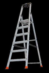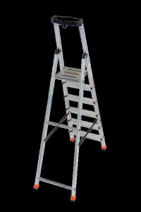 Односторонняя алюминиевая стремянка c высокой дугой безопасности, с большой алюминиевой площадкой с противоскользящими полимерными накладками. Прочные боковины подъемной и опорной частей из алюминиевой прямоугольной трубы. Безопасное шарнирное соединение направляющих с обхватом боковин. Большая полка для инструментов с крюком для ведра. Профилированные ступеньки шириной 80 мм для безопасного подъема и удобного положения при работе. Многократное прочное заклепочное соединение ступенек с боковинами. Противоскользящие опорные наконечники обеспечивают устойчивое положение. Важным преимуществом являются двухкомпонентные наконечники боковин с резиновым основанием.