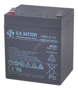 Аккумуляторные батареи BB BATTERY HR5,8-12 используют технологию AGM (электролит абсорбирован в стекловолоконный сепаратор). Данная модель имеет напряжение 12 В и емкость 5.3 Ач. Герметичный корпус из неокисляемого ABS-пластика позволяет монтировать аккумулятор в любом положении, кроме установки на крышку. Срок службы B B BATTERY HR5,8-12 составляет 10 лет, он практически не требует обслуживания (в том числе долива воды) и работает как в циклическом режиме, так и в режиме постоянного подзаряда.