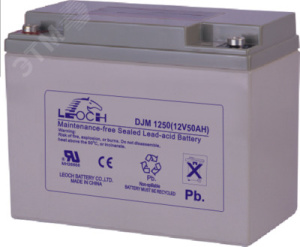 Свинцово-кислотный аккумулятор Leoch DJM 1250 с ёмкостью 50 Ач, напряжением 12 В может эксплуатироваться в циклическом (260 циклов при глубине разряда 30%) и буферном (до 12 лет) режимах. Материал корпуса — прочный неокисляемый ABS-пластик, на крышке располагается клапан избыточного давления. Leoch DJM1250 создан с использованием стекловолоконных сепараторов, они удерживают электролит неподвижно. Рекомбинация газов происходит внутри корпуса изделия, это исключает возможность протечки электролита и делает аккумулятор необслуживаемым.