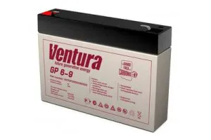 Аккумулятор Ventura GP6-9 обладает низким внутренним сопротивлением, он может использоваться в буферном и циклическом режимах. Благодаря своим характеристикам (9 Ач, 6 В) и продолжительному сроку службы (6 лет) он применяется в ИБП, нефтегазовой отрасли, охранно-охранных системах и телекоммуникациях. Корпус представляет из себя герметичный моноблок, выполненный из ABS-пластика, на крышке которого располагается односторонний клапан избыточного давления, это позволяет использовать Ventura GP 6-9 в горизонтальном и вертикальном положении (установка на крышку не допускается). Сепараторы из стекловолокна (AGM) удерживают жидкий электролит неподвижно.