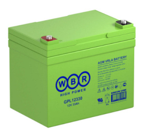 Аккумуляторная батарея WBR серии GPL 12330 - герметизированные, выполненные по технологии AGM, свинцово-кислотные аккумуляторные батареи общего применения с увеличенным 12 летним сроком службы в буферном режиме или 260 циклов заряда-разряда в циклическом режиме при 100% разряде. Эти высокоэффективные перезаряжаемые батареи не требуют обслуживания в течение всего срока службы.