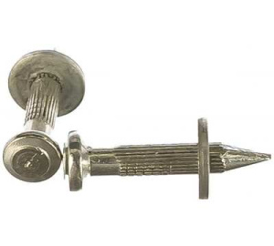 Представляет собой металлический гвоздь, который имеет широкую шляпку и подвижную шайбу в районе острия. Шайба необходима для центровки и фиксации дюбель-гвоздя в монтажном пистолете перед выстрелом. Цинковое покрытие придает устойчивость к коррозии и защищает от появления подтеков ржавчины на лицевой части прикрепляемого материала.