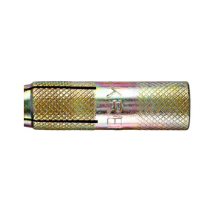 Анкер забивной DRM представляет собой полый цилиндр с внутренней метрической резьбой, на внешней поверхности которого имеются специальные насечки и прорези, которые образуют 4-х сегментную распорную зону. Анкер изготовлен из углеродистой стали, покрытие – желтый цинк.