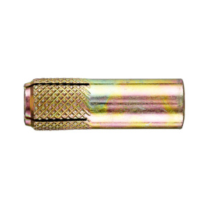 Анкер забивной DRM представляет собой полый цилиндр с внутренней метрической резьбой, на внешней поверхности которого имеются специальные насечки и прорези, которые образуют 4-х сегментную распорную зону. Анкер изготовлен из углеродистой стали, покрытие – желтый цинк.