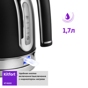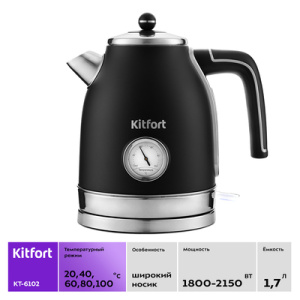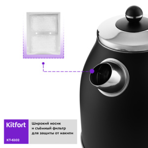 Чайник Kitfort КТ-6102 имеет встроенный термометр, выполненный в винтажном стиле. Это очень удобно для заваривания различных напитков, для которых требуется определённая температура воды. Крышка чайника полностью съёмная, что облегчает доступ внутрь чайника. За один раз в чайнике можно вскипятить до 1,7 л воды. Этого хватит, чтобы приготовить горячие напитки на большую семью! Мерная шкала позволяет легко следить за уровнем воды. В кнопку включения/выключения встроен индикатор нагрева. Специальная форма носика позволяет точно наливать воду в чашку без расплёскивания и брызг и быстро наполнять её. В носике чайника расположен съёмный фильтр от накипи, который задерживает частички накипи и предотвращает их попадание в чашку. Чайник оснащён контроллером Strix - № 1 среди поставщиков компонентов для электрочайников. Он устраняет риски короткого замыкания. Обеспечивает защиту при закипании.
