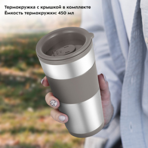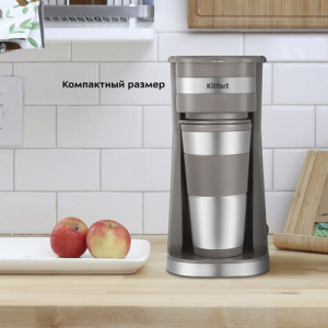 Капельная кофеварка КТ-7316 готовит ароматный чёрный кофе из молотого кофе одним нажатием кнопки. Компактная кофеварка экономит место на кухне и рассчитана на приготовление кофе за один раз на одну-три чашки. Многоразовый фильтр вмещает около 20 гр. кофе. Кнопка ''Вкл/Выкл'' включает и выключает устройство. Когда кофеварка работает, горит индикатор кнопки ''Вкл/Выкл''.Кофеварка отключается автоматически через 7 минут после включения. В кофеварке вода доводится до температуры 80-90 С, после чего медленно поступает в фильтр с молотым кофе. Многоразовый фильтр позволяет заваривать кофе неограниченное количество раз. Резервуар для воды вмещает до 420 мл воды. Термокружка выполнена из пластика и нержавеющей стали с силиконовой вставкой, которая не даёт вам обжечься. Крышка термокружки позволяет пить кофе на ходу, благодаря удобной форме отверстия для питья, которое можно закрывать.