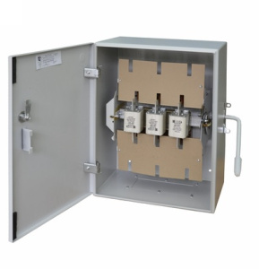 Ящик с блоком 'Предохранитель - Выключатель' унифицированный 250 Ампер. Отличительной особенностью является подвижный блок с предохранителями, выполняющих функцию подвижного контакта. Силовые проводники подключаются к неподвижным контактам основания предохранителей. Отключение силовой цепи обеспечивается двойным видимым разрывом. Механизм включения – отключения защищен патентом РФ на ''Полезную модель'', имеется возможность блокировки дверки, а также есть возможность дополнительно заблокировать рукоятку от оперирования висячим замком. Блок предназначен для нечастых (не более трех в час) включений – отключений силовых цепей, напряжением до 400В переменного тока частотой 50Гц, а также защиты их при перегрузках и коротких замыканиях. Оснащен уголком заземления, защищенным от краски, с двумя отверстиями.