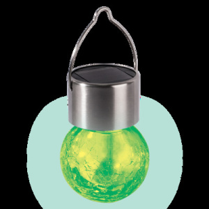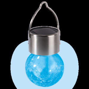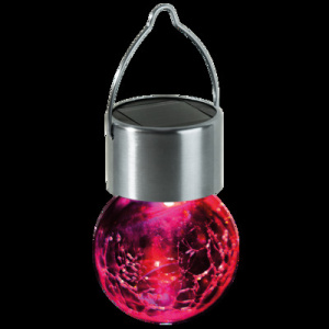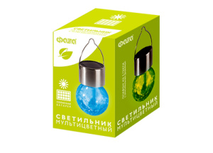 Мультицветный светильник с солнечной батареей. Предназначен для декоративной подсветки комнат, террас, веранд на садовых и дачных участках. Можно использовать для декорации кустарников и деревьев. Колба отлита по технологии растрескавшегося стекла для создания бликов при свечении