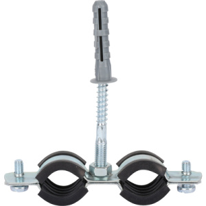 Трубный двойной хомут представляет собой спаренный сантехнический обрезиненный хомут с одной крепежной гайкой для крепления к стене. Применяется для разводки парных труб горячего и холодного водоснабжение в промышленном и гражданском строительстве