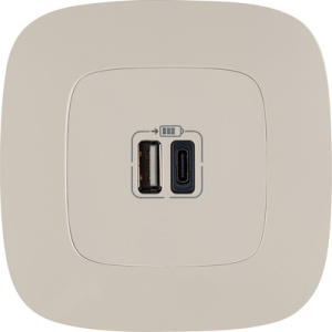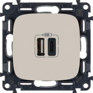 Valena ALLURE.Зарядное устройство с двумя USB-разьемами тип А-тип С 240В/5В 3000мА.С лицевой панелью.Цвет Слоновая кость