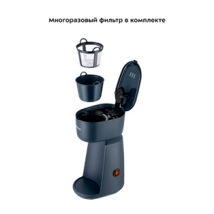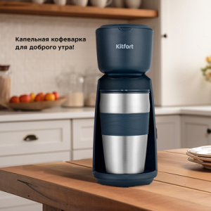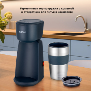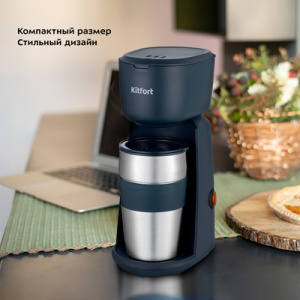 Капельная кофеварка КТ-7305 готовит ароматный черный кофе из молотого кофе одним нажатием кнопки. Компактная кофеварка экономит место на кухне и рассчитана на приготовление кофе за 1 раз на 1-3 чашки. Многоразовый фильтр вмещает 20 грамм кофе. В кофеварке горячая вода медленно поступает в фильтр с молотым кофе. Многоразовым фильтром можно пользоваться любое количество раз. Сетка фильтра изготовлена из нейлона. Фильтр вмещает 20 грамм молотого кофе, а резервуар для воды имеет емкость 420 мл. Термокружка выполнена из нержавеющей стали с силиконовой вставкой, которая не дает вам обжечься. Крышка термокружки позволяет пить кофе на ходу, благодаря удобной форме отверстия для питья, которое можно закрывать. Кофеварка лёгкая, стильная и занимает мало места, что очень удобно в квартирах с маленькими кухнями.