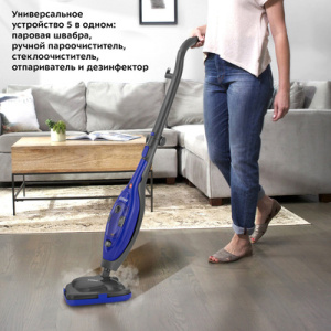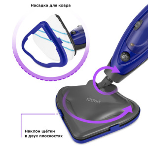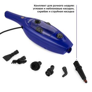 КТ-1059 – устройство, способное эффективно устранить загрязнения и провести дезинфекцию. Прибор можно использовать как 5 устройств - паровая швабра, ручной пароочиститель, стеклоочиститель, отпариватель и дезинфектор. Тряпка для пола устанавливается на напольную щётку с помощью липучек. В комплекте есть рамка для ковра для скольжения по ворсу. В комплекте для ручного модуля одна угловая и плоская насадки. А также нейлоновые щётки и скребок. Чтобы помыть окна, зеркала и кафельную плитку, присоедините насадку с резиновым скребком. Насадка со скребком и тряпочкой используется для отпаривания вещей и других текстильных предметов. Резервуара для воды 300 мл. Мерным стаканчиком в комплекте удобно залить воду. Кнопка над резервуаром включает и выключает нагрев, а регулятор под ним меняет уровень подачи пара. Для смотки шнура длиной 4,7 м.