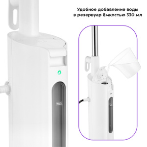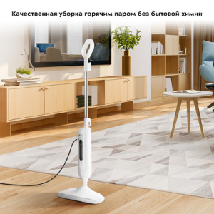Паровая швабра КТ-1052 — универсальное устройство, которое поможет избавиться от пыли и грязи. Тряпка надёжно фиксируется на боковые липучки щётки. Паровая швабра имеет большой угол наклона при уборке. Напольная щётка закреплена на специальном шаровом шарнире с наклоном в 2 плоскостях. Резервуар для воды ёмкостью 330 мл. Мигание индикатора указывает на нагрев воды. Когда устройство готово к работе, индикатор горит непрерывно. КТ-1052 обладает функцией вертикальной парковки. Излишки шнура, длина которого составляет 5 м, можно хранить на специальных держателях. Прибор включается и выключается 1 кнопкой. Вода из резервуара подаётся помпой (водяной насос) в заранее прогретый до высокой температуры бойлер. В нём вода моментально преобразуется в пар и выходит из сопла в напольной щётке. Все части паровой швабры разборные.