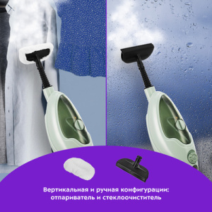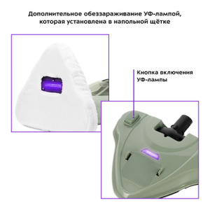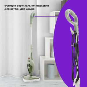 Паровая швабра КТ-1076 - универсальное устройство, которое поможет избавиться от пыли и грязи. При отсоединении удлинительной трубки КТ-1076 превращается в ручной пароочиститель. С помощью скребка для стёкол КТ-1076 может помыть окна, зеркала и кафельную плитку. В насадке для пола установлена ультрафиолетовая лампа. Тряпка для пола закрепляется на напольной щётке при помощи верёвки. В комплекте есть рамка для ковра. При включении прибора загорится индикатор, и начнётся нагрев бойлера. Время нагрева - 15 сек. У паровой швабры ёмкость резервуара составляет 450 мл. В комплекте идёт мерный стаканчик с удобным зауженным носиком. Паровая швабра КТ-1076 имеет функцию вертикальной парковки. На удлинительной ручке предусмотрены держатели для шнура. Его длина – 2,8 м.