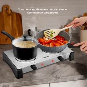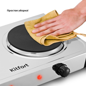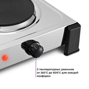 Электрическая плита КТ-181 поможет приготовить блюда самой разнообразной кухни. Плита простая в управлении, поэтому с приготовлением на Плита оборудована вращающимися регуляторами, с помощью которых можно быстро и удобно настроить необходимый нагрев. У электрической плиты 5 режимов нагрева от 160 до 600 С. Индикаторы нагрева укажут, когда плитка нагревается до установленной температуры. Мощность каждой конфорки – 1000 Вт, так что вы сможете приготовить даже самые сложные блюда! На обратной стороне плиты есть вентиляционные отверстия, которые способствуют быстрому охлаждению устройства во время интенсивной работы и после её завершения. В плите установлены специальные термопредохранители для каждой конфорки, которые в случае перегрева плиты разорвут электрическую цепь и отключат нагрев. Корпус и конфорки выполнены из металла, поэтому плиту легко очистить от загрязнений.