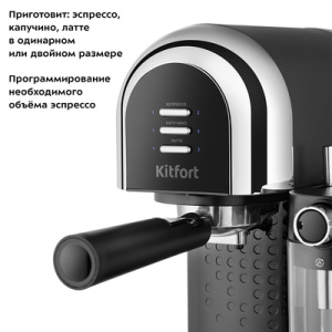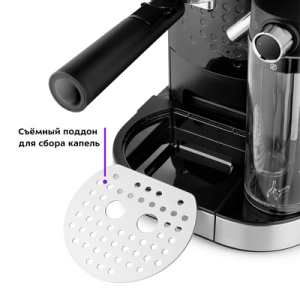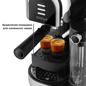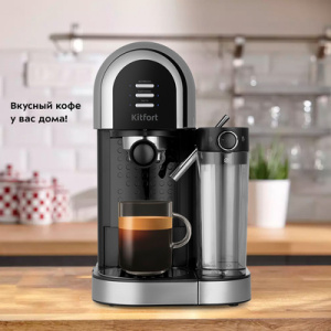 Рожковая кофеварка Kitfort КТ-7112 приготовит ароматный кофе эспрессо, капучино или латте, а также множество других видов кофе. Трубка забора молока находится в резервуаре и погружена в холодное молоко. Во время приготовления капучино или латте, кофеварка приготовит эспрессо, автоматически взобьёт молочную пену и подаст её прямо в чашку. Металлические фильтры с лазерным нанесением отверстий долговечны и не требуют использования расходующихся частей. Резервуары для воды и молока съёмные и легко моются. Крышка резервуара для воды снимается, поэтому можно заливать воду в резервуар, не снимая его. Поддон для сбора капель со съёмной решёткой из нержавеющей стали легко снимается, моется и устанавливается обратно. Если вы используете слишком высокую чашку, то можно убрать этот поддон.