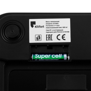 Модель КТ-805 представляет поколение умных весов. На платформе встроены металлические круги, встав на которые проводится диагностика тела. Далее весы легко синхронизируются с приложением ''Fitdays'' по Bluetooth, где будут отражены показатели вашего тела. Вся информация будет храниться у вас в телефоне. В течение 5 секунд после взвешивания, в приложении отразятся важнейшие параметры вашего тела. Среди них - вес, возраст тела, содержание воды, белка, жира и костной массы в вашем организме, общий баланс вашего тела и многие другие. Чтобы узнать вес ребёнка, активируйте режим ''Baby Mode'', предварительно встав на весы без него, а затем вместе. Весы сами рассчитают вес ребёнка и запомнят его. Весы запоминают информацию по каждому пользователю, всего можно добавить до 24 человек. На обратной стороне устройства находится разъём для батареек.