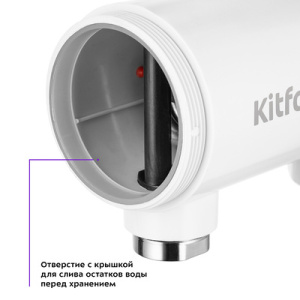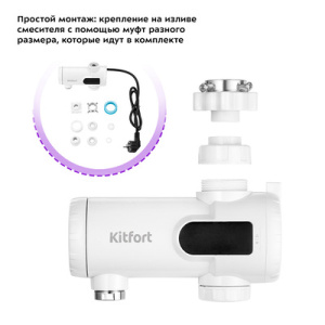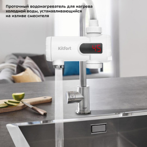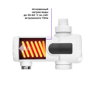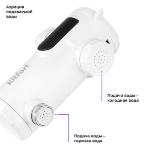 Проточный нагреватель КТ-4033 - это смеситель, предназначенный для быстрого нагрева холодной проточной воды. В корпусе установлен ТЭН, который быстро нагревает воду, проходящую через устройство. Отличительной особенностью проточных водонагревателей является постоянство t С воды. t С нагрева регулируется напором воды - чем меньше напор, тем выше t С. На корпусе устройства расположен дисплей, который отображает текущую температуру горячей воды. С помощью регулятора переключается подача холодной (без прохождения через ТЭН) и горячей воды и регулируется напор. Прибор крепится на изливе смесителя с помощью муфт, которые идут в комплекте. Аэратор насыщает воду кислородом, что способствует выветриванию хлора, также это помогает снизить уровень шума потока воды за счёт смешивания его с воздухом и экономит расход воды.