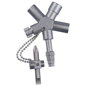 Универсальный ключ подходит для систем запирания в области электротехники, а также для специального применения в строительстве, сантехнике, системах вентиляции и кондиционирования. Изготовлен из цинкового литья под давлением. Профили входящие в комплект - внутренний четырехгранник 6 - 7 мм, 8 - 9 мм, Внешний четырехгранник 5 - 10 мм, двойная бородка 3 - 5мм, внутренний трехгранник 7 - 9 мм, внутренний трехгранник 11 мм, бита РН и шлиц с внутренним квадратом на 5 мм и полумесяцем на цепочке.